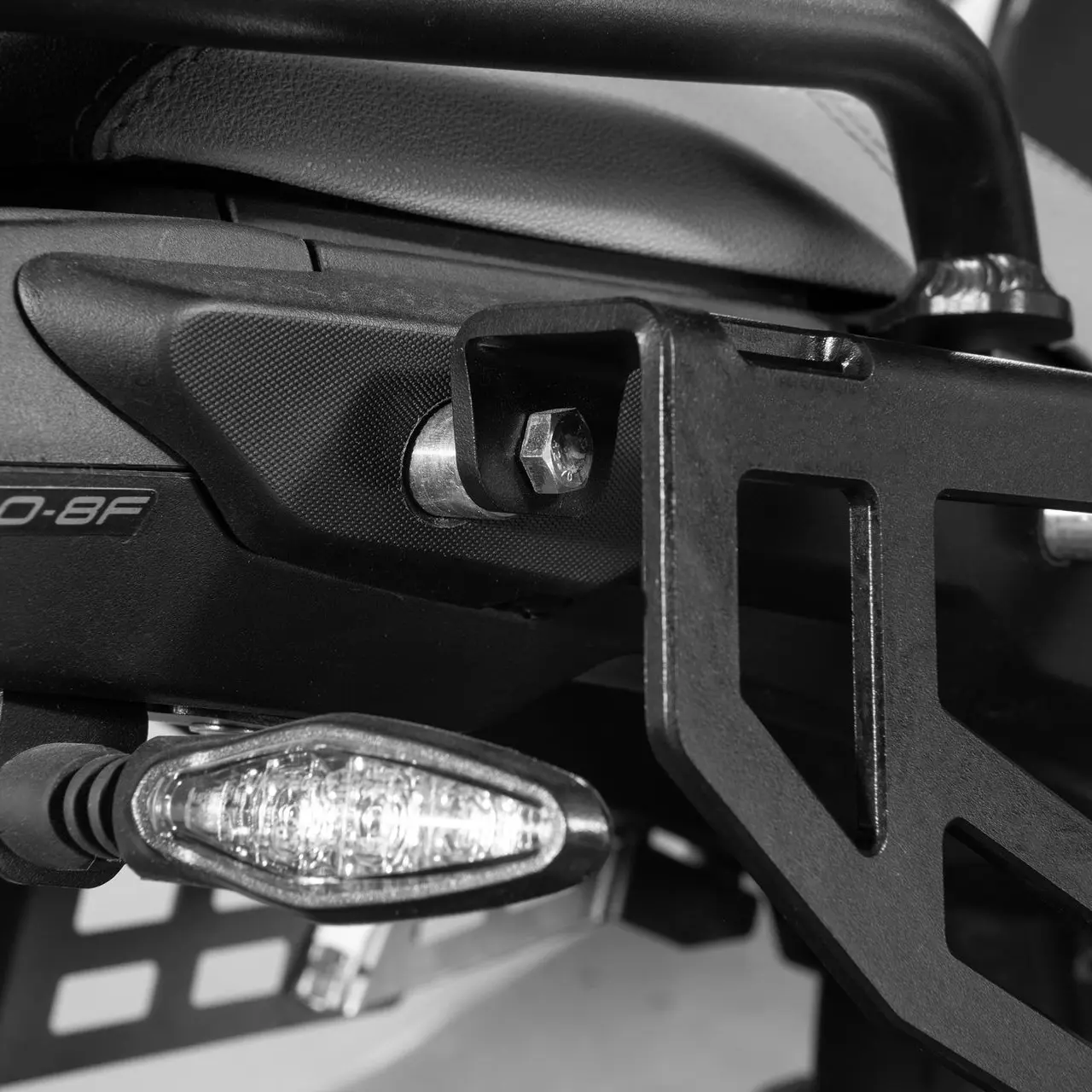 Includes optional exhaust hanger. This allows the side racks to be used either with or without the OEM pillion foot pegs. Exhaust hanger is constructed from powder coated steel for heat management.