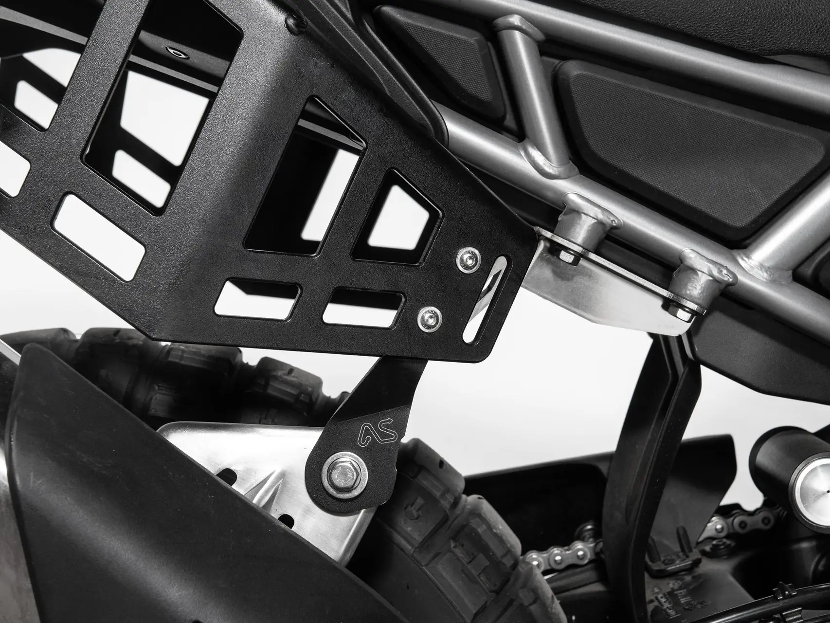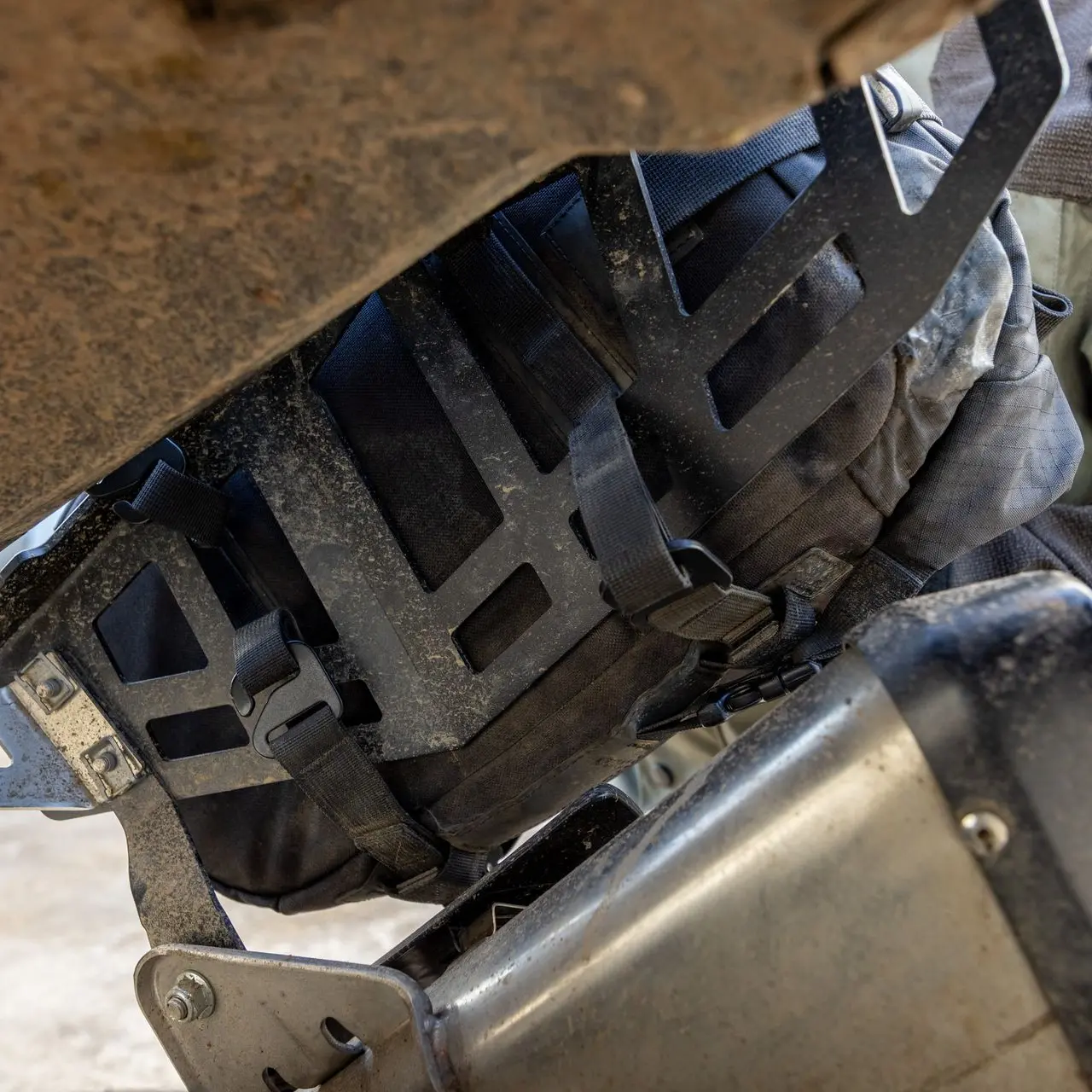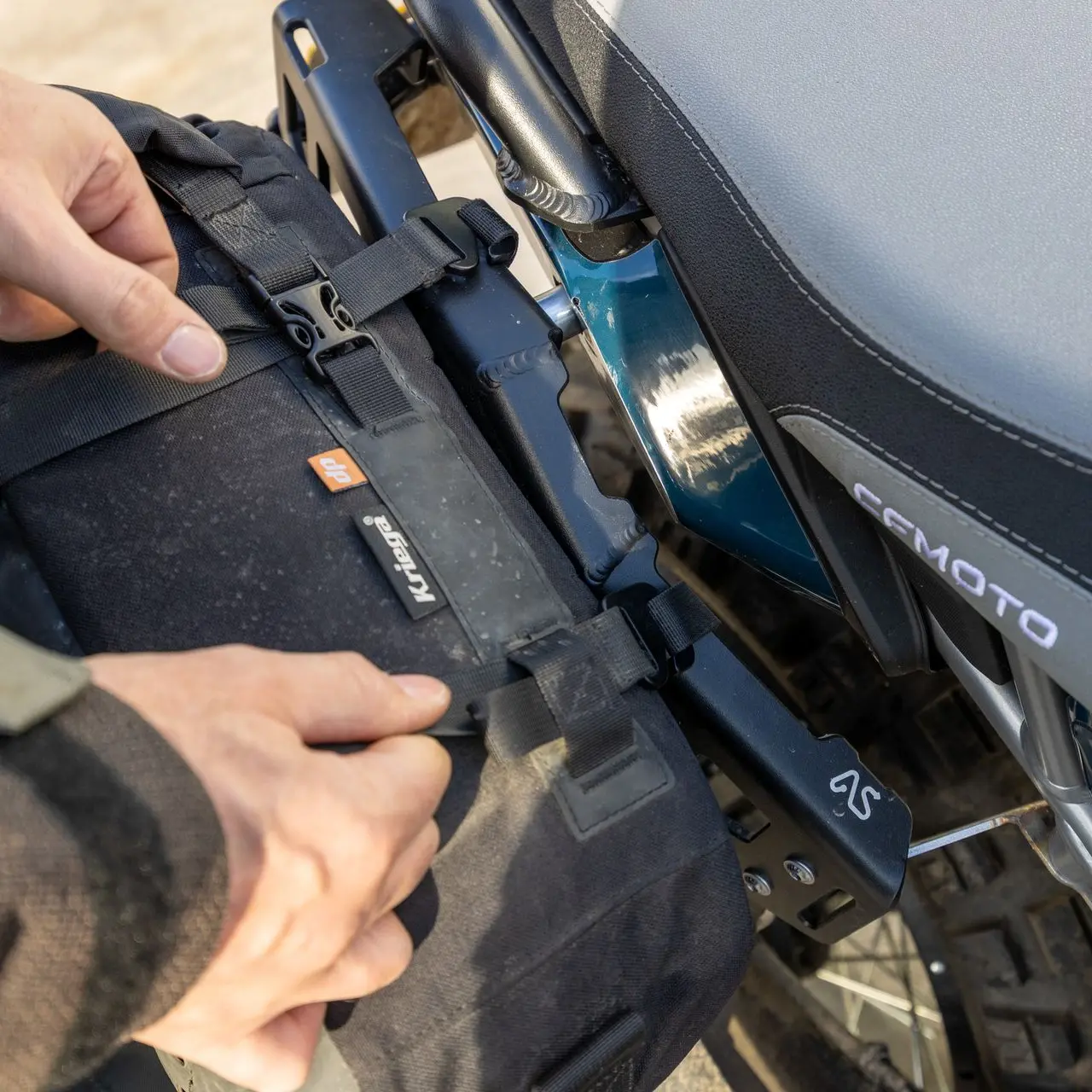 Side Luggage Supports for your CF Moto 450MT. These lightweight and rugged aluminium supports will give you the base you need for mounting soft panniers. Proven to work well with a wide range of luggage systems including Mosko Moto Reckless, Kriega OS and others. Designed to work with our Rear Rack which is sold separately. Includes optional exhaust hanger to allow use with or without pillion foot pegs. Weight = 2.18kg / 4.8lb