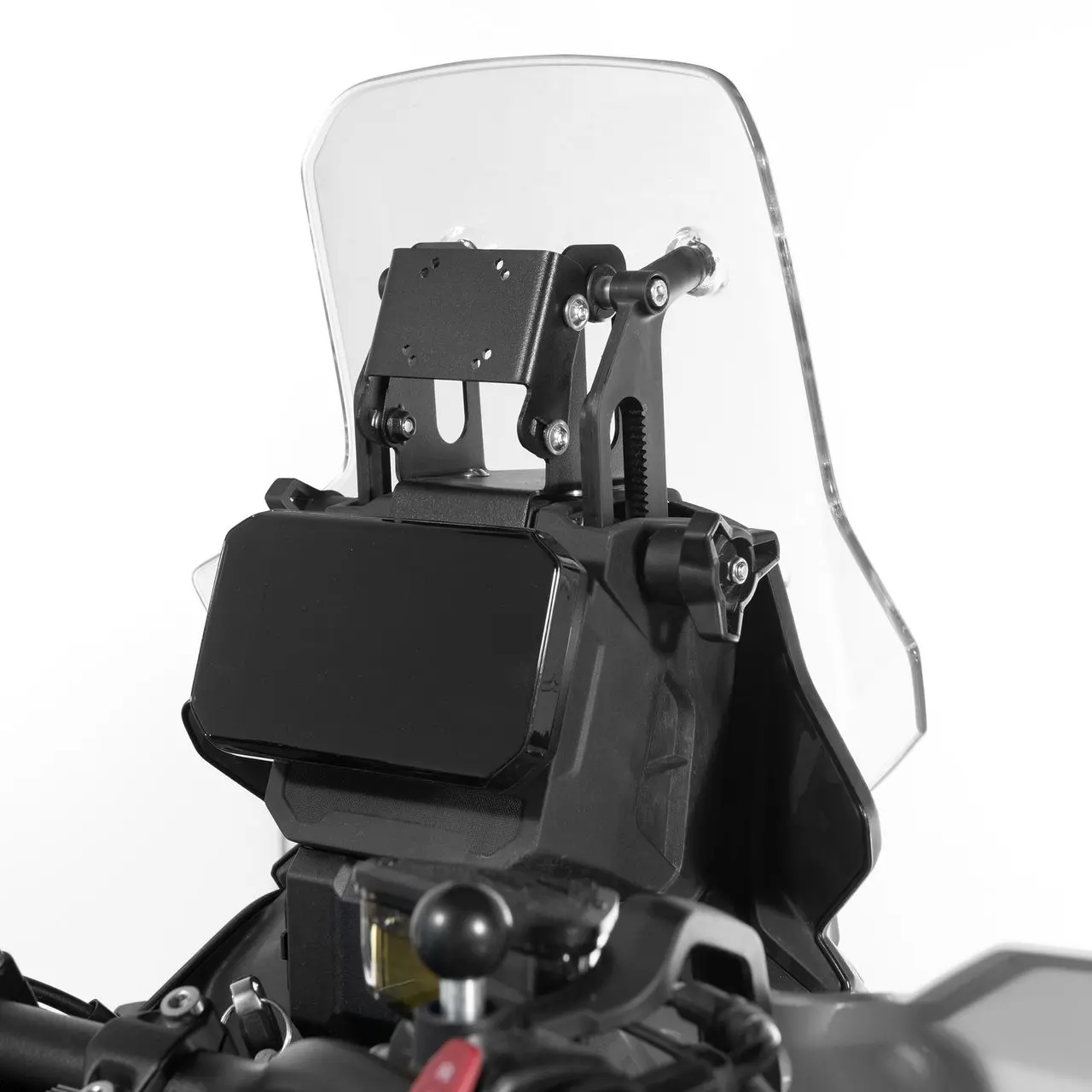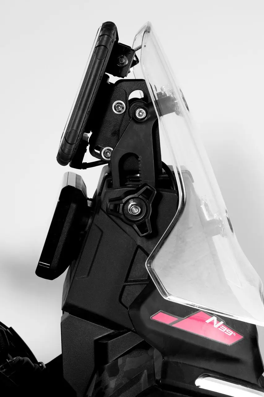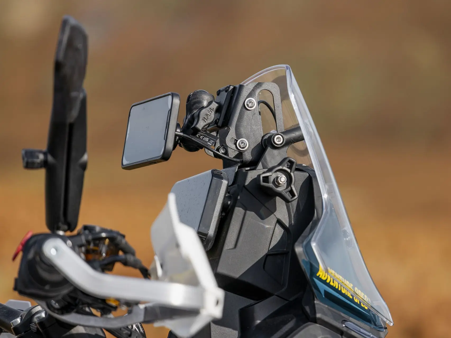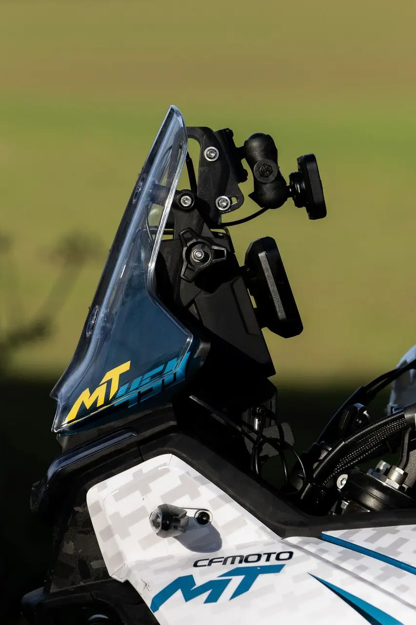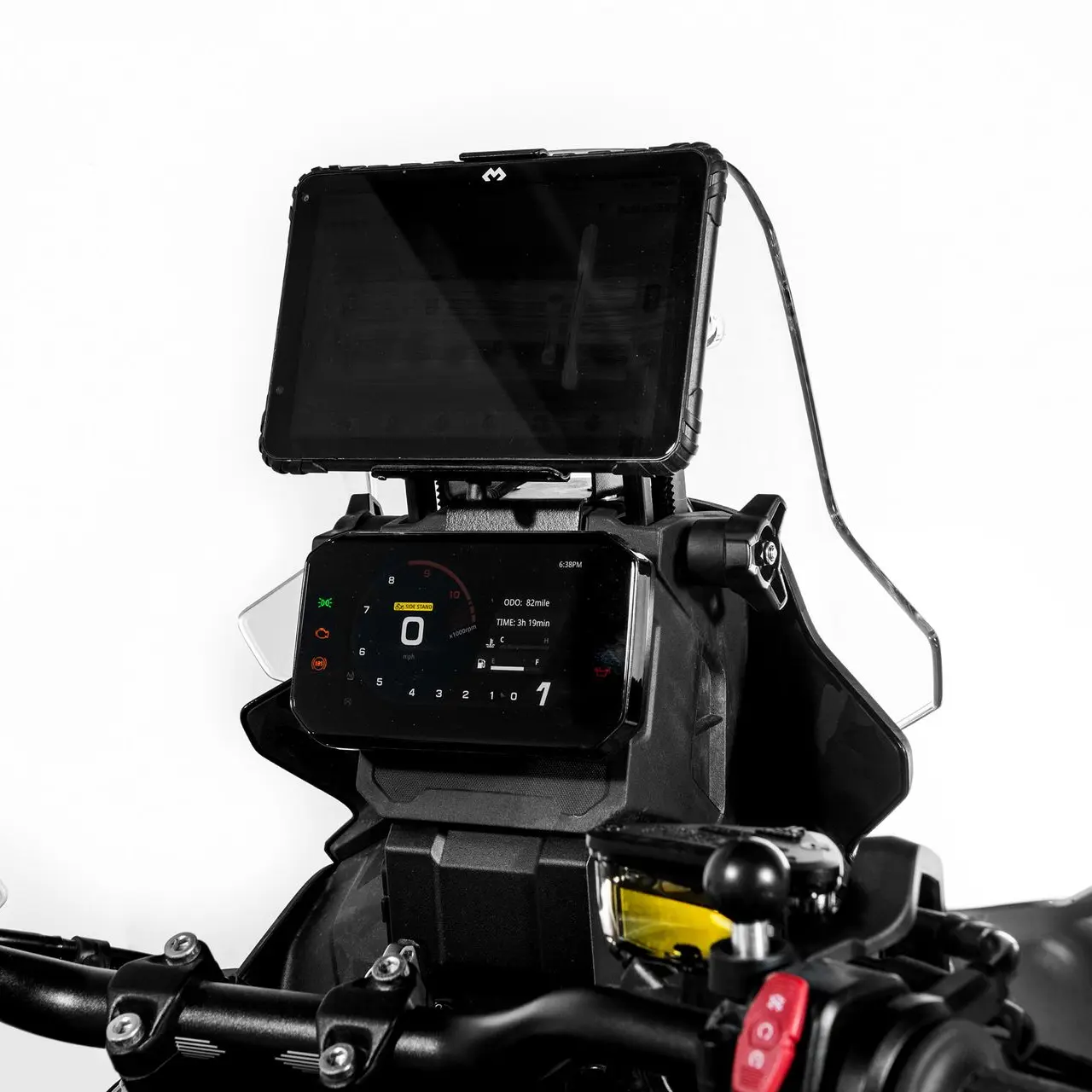 GPS navigation / tablet / phone mounting support for your CF Moto 450MT. Lightweight and neatly mounted above the bikes OEM dash. Allows for screen height adjustment. Adjustable angle (up and down) and compatible with AMPS brackets. Keeping essential navigation device in eye sight. Weight = 460g / 16.2oz.