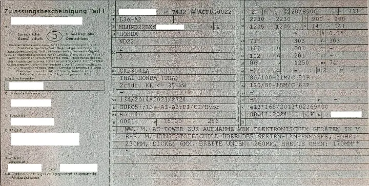 Now that this has been done once, if German customers want to get their bike individually approved with a COLOURED mini fairing screen, then they can send the vehicle registration document Peter passed over (below) to the TÜV as precedent, and have an entry made there according to §19.2 in conjunction with §21.