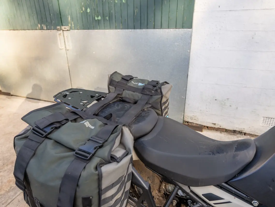 Lay the Magadan Panniers over the rear of the bike, resting against the side luggage racks. Use the connecting straps to fine tune positioning.
