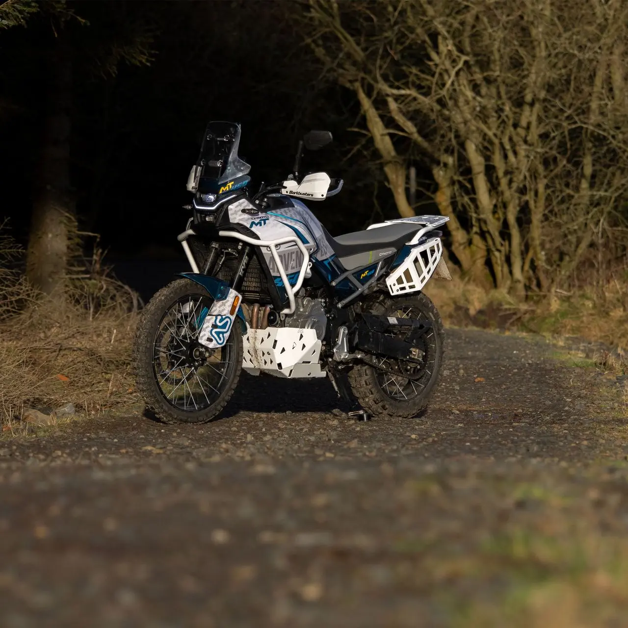 A rugged 4mm thick Aluminium Bash plate / Skid plate for your CF Moto 450MT motorcycle. Designed to protect your engine, frame and exhaust. Additional HDPE sliders add extra protection to rear suspension linkage. Weight = 3.34kg / 7.1lb