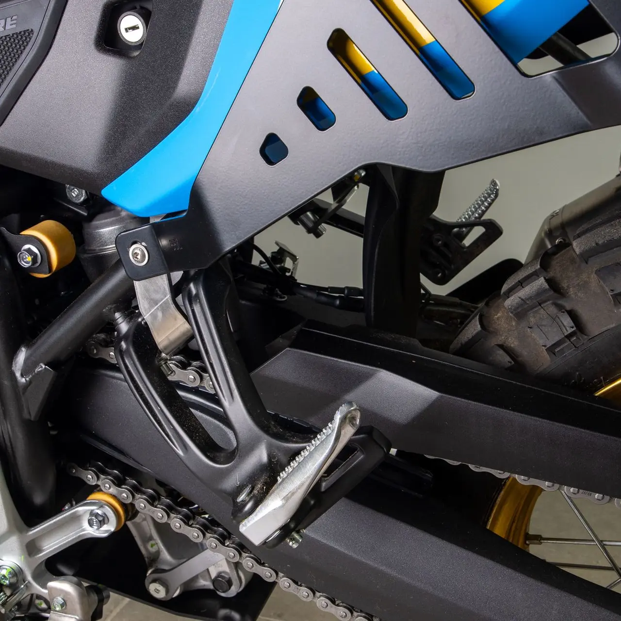 A set of powder coated, simple, lightweight rear luggage plates designed to keep your soft luggage from folding under your back wheels on your Yamaha Tenere 700 / T7 / T700. Weight 1.6kg / 3.5lb