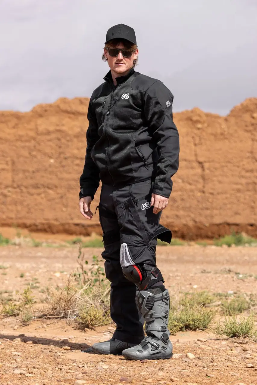 Sam also wears the Mongolia Jacket 2.0 Black and Dirt Gloves.