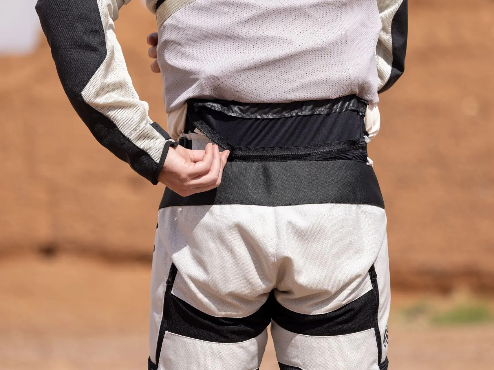 The Mongolia OTB Pant 2.0 features an innovative floating knee armour pocket. This allows you to tuck the supplied knee armour into your adventure boot securing it in place for safety and creating a comfortable fit both standing and sitting.